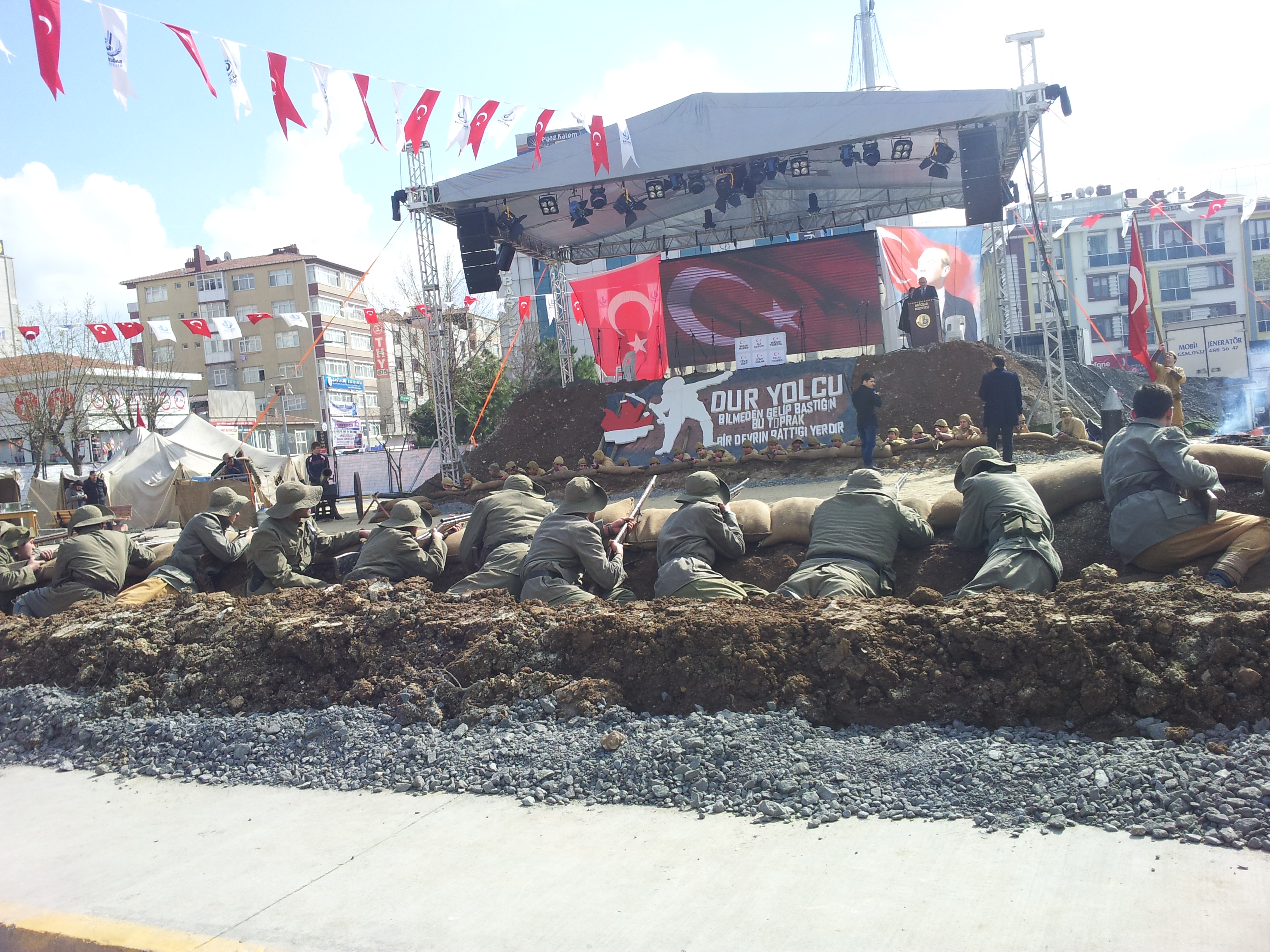 Yazarımız Yusuf Dursun, 18 Mart 2015 Çarşamba günü saat 14.00/16.00 arasında Bağcılar’da idi. Bağcılar Meydanı’na, Bağcılar Belediyesi tarafından kurulan “Çanakkale Platformu”nda, Çanakkale Zaferinin 100. yıl dönümü etkinliklerine katıldı.Canlı siperlerle, atlarla, sahra hastaneleriyle, tiyatro gösterisiyle, 100 kişilik müzik grubuyla harika bir gösteri izledi.